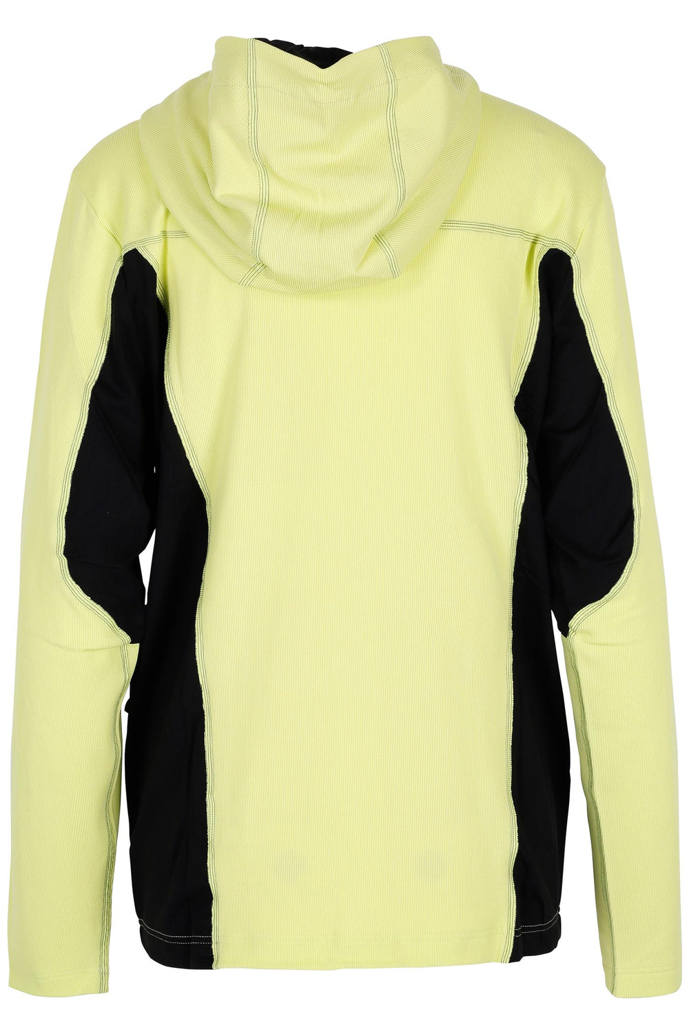 Jakke med hette, glidelås, to lommer i sidene nede og en på høgre bryst, alle med glidelås.