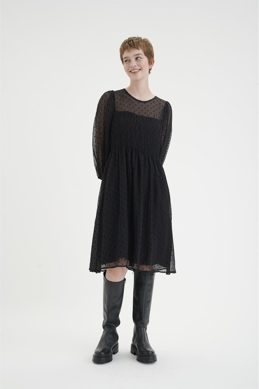 Nyfelig kjolr fra Inwear pynta med lekkert prikkmønster, trekvarts ballongermer og vaffelsøm i overpartiet som skaper en lekker a-fasong og drar fokuset mot midjen. Aizza har en lengde til ca. kneet og en nett åpning bak i nakken. Kjempefin med høge boots og tykke stømpebukse eller en lekker hæl og tynne strømpebukse.