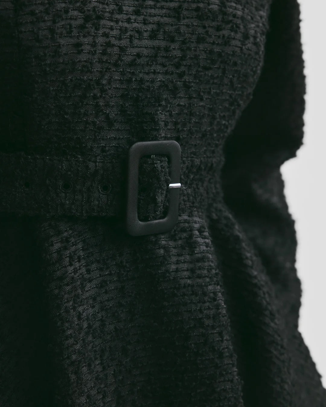 Denn kjolen er laget i et vakkert teksturerte ullkvalitet. Kjolen har kort lengde, rund hals, lange ermer og et A-linjeformet skjørt. Den kommer med et matchende belte i samme stoff og lukkes med glidelås i ryggen.