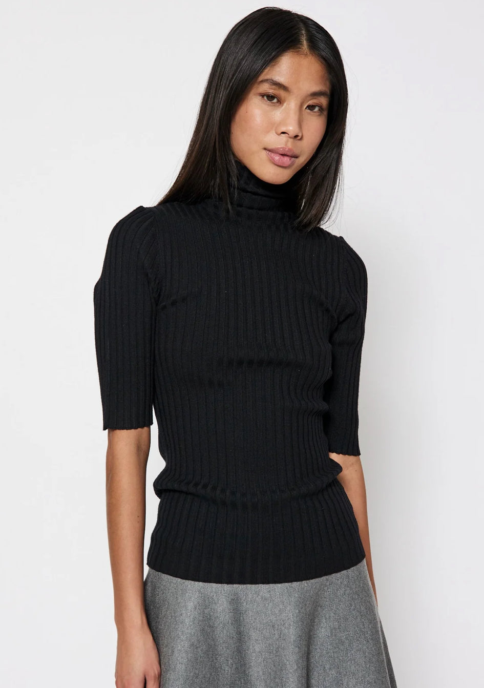 Denne strikkede t-skjorten er laget i en myk og elastisk viskoseblanding. Den har høy hals, korte ermer og en kropp i tilpasset form.