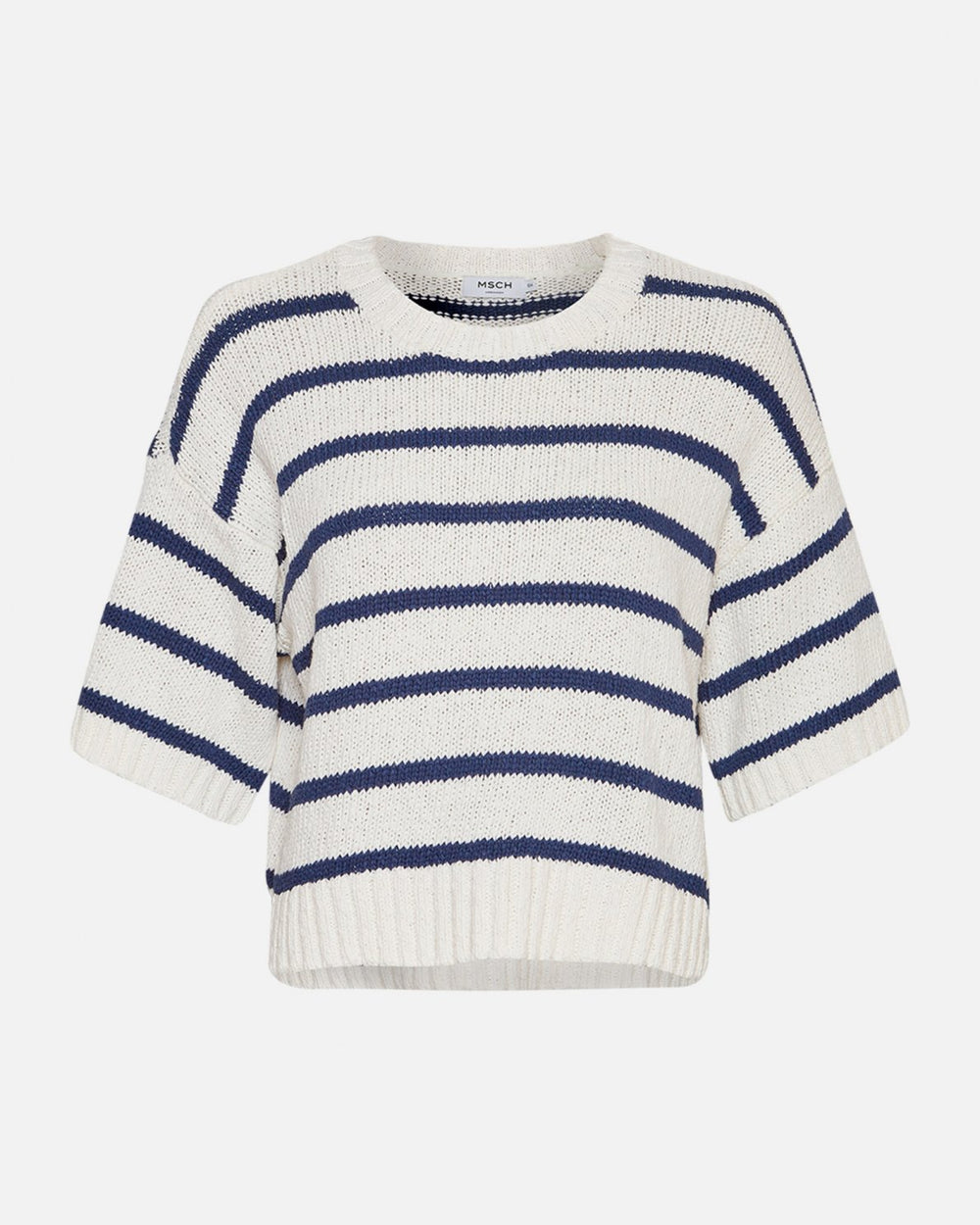 Kortermet strikket genser med horisontale striper i et mykt materiale. Det er en myk strikket genser med rund halsutringning og senkede skuldre, som kan være en uanstrengt utgave av ethvert antrekk, og et sterkt grunnlag for en allsidig garderobe. Kombiner med go-to jeans, et lett luftig sommerskjørt eller elegante bukser, kan det lage et uanstrengt chic antrekk på ingen sekunder. Denne genseren har en boxy passform. 100% bomull.