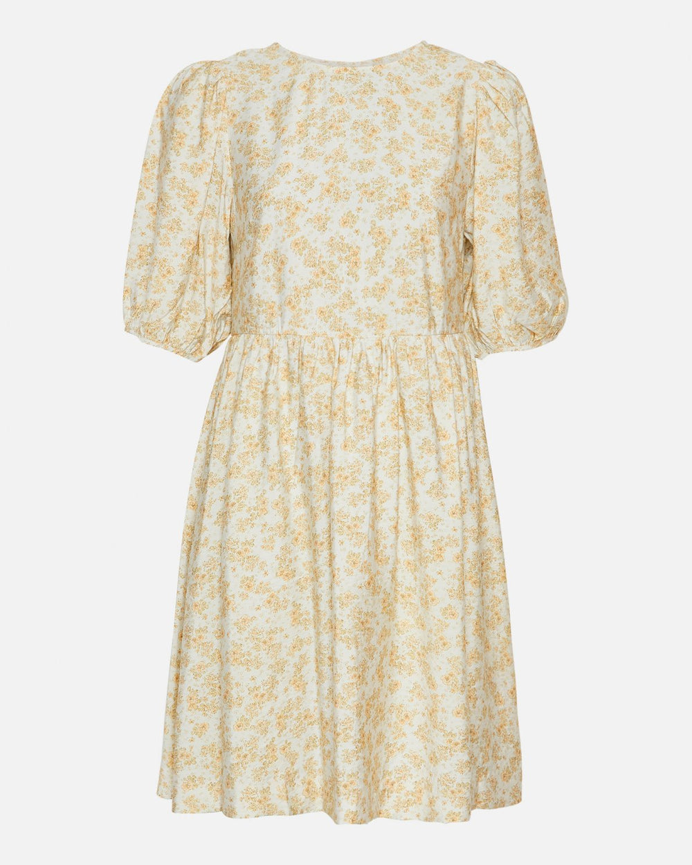 Blomsterkjole Marva-serien er en samling stiler i et feminint, lysegult blomstertrykk. Kjolen har korte, puffermer, elastiske mansjetter og rund hals med sløyfedetaljer bak. Kjolen kan pyntes opp for en fancy begivenhet, eller brukes med flip flops for de varme sommerdagene. Style den med hvit eller beige for å matche nyansene i trykket, eller style den med blå for å gi den litt kontrast.