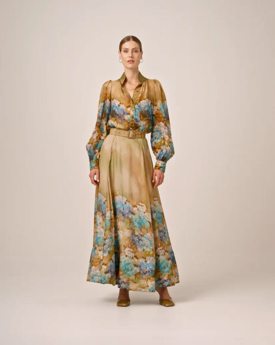 Organza Maxi-skjørtet er kuttet i elegante og litt rene FSC-sertifiserte viskosekvalitet. Skjørtet har en maxi-lengde, en tilpasset midjelinje med en flytende og voluminøs silhuett. Skjørtet er fôret og lukkes i siden med glidelås. Den har beltebøyler, og kommer med et løst, matchende belte.
