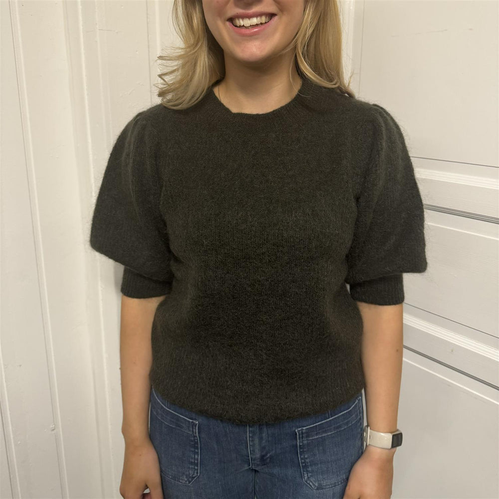 Cille 13 Pullover fra Levete Room er en delikat strikkegenser med halvlange puffermer. Genseren har rund hals og har en feminin, avslappet passform som gjør den behagelig å ha på. Den kan brukes alene eller styles med en skjorte under for et mer lagdelt uttrykk. Dette er et allsidig plagg som passer perfekt til både hverdagsbruk og mer formelle anledninger.
