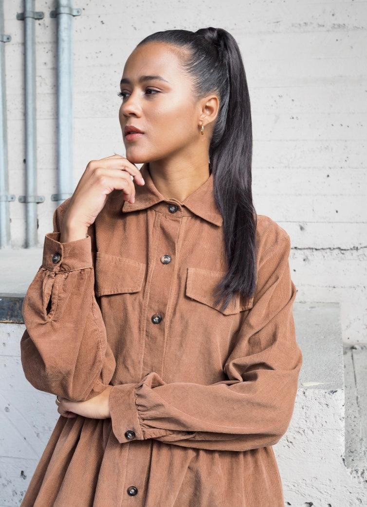 Nydelig kjole i mykeste babycord. Rålekker modell med lommer på brystet, knapper helt ned nydelig fin passform.