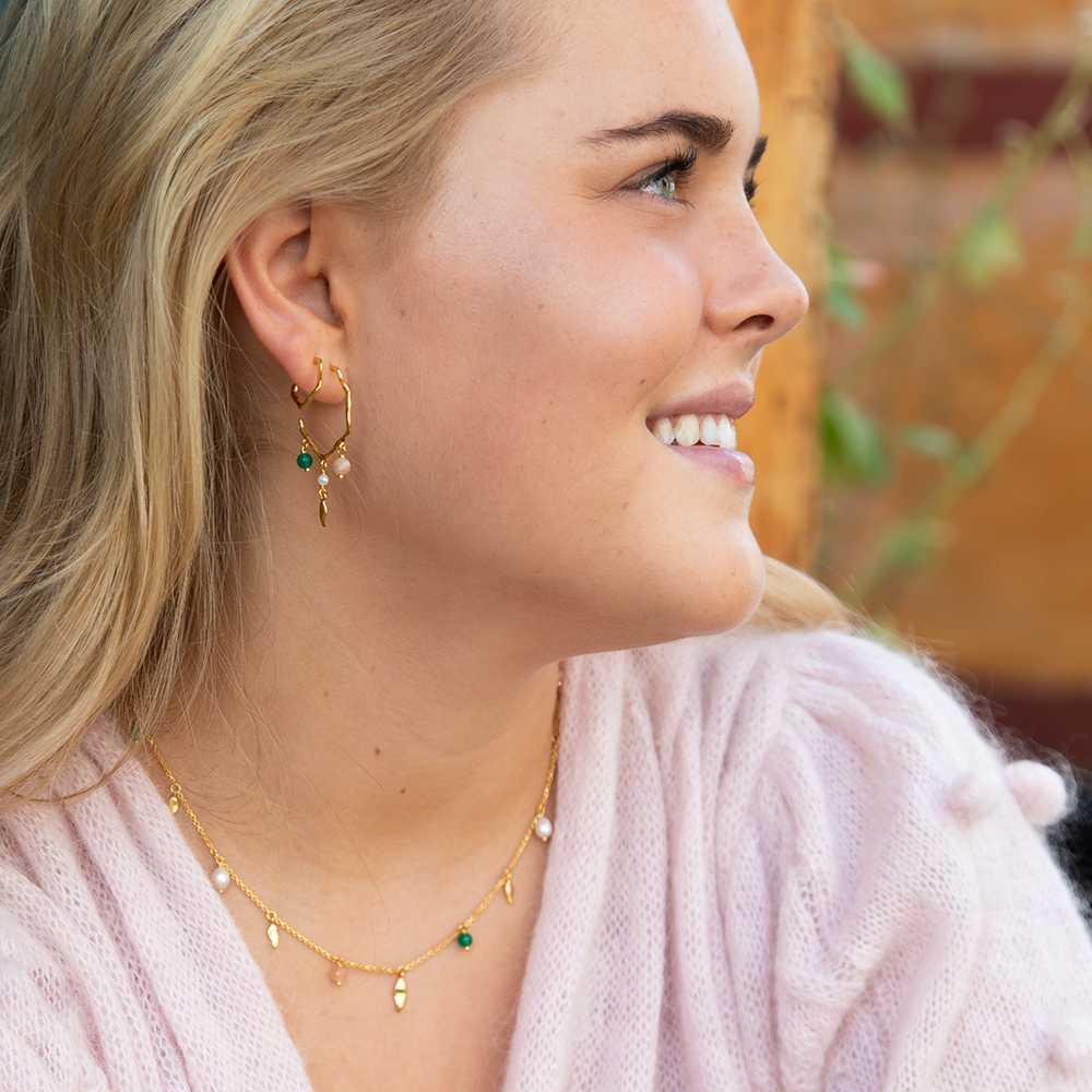 Mia x Sistie gullbelagte kreoler med ferskenmånestein, ferskvannsperle og grønn onyx