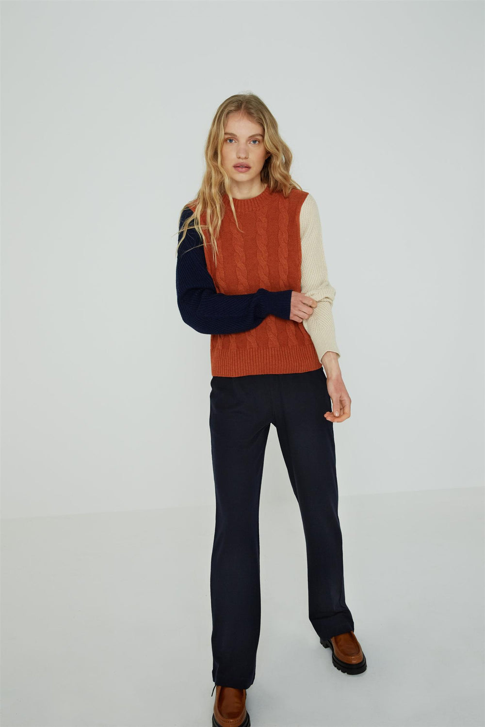 Trefarget ullgenser med rund nakke og flettedetaljer. Ensfarget bak.