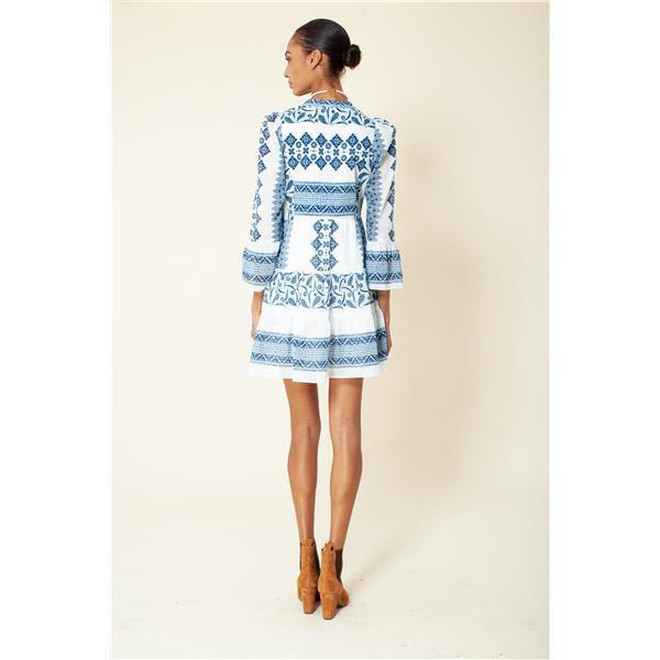 Nydelig, feminin kjole fra Hale Bob i myk og deilig viskosekvalitet. V-utringning og lekre broderinger i blå nyanser. Skjørtedel med volanger og ermer med volangkant nederst. 100% Viskose Rens anbefales