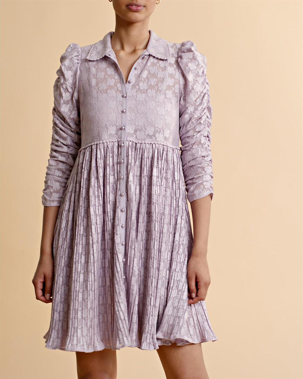 Plisse Shift Kjole er kuttet i luftige og delikate polyester plisse kvalitet. Den har en avslappet passform og lange ermer laget av rouching. Kjolen har en krage og perleknapper foran. Kjolen er dekket av vakre blonderinnlegg. Stoff: 100% Polyester – GRS-sertifisert, Blonder: 100% Polyester