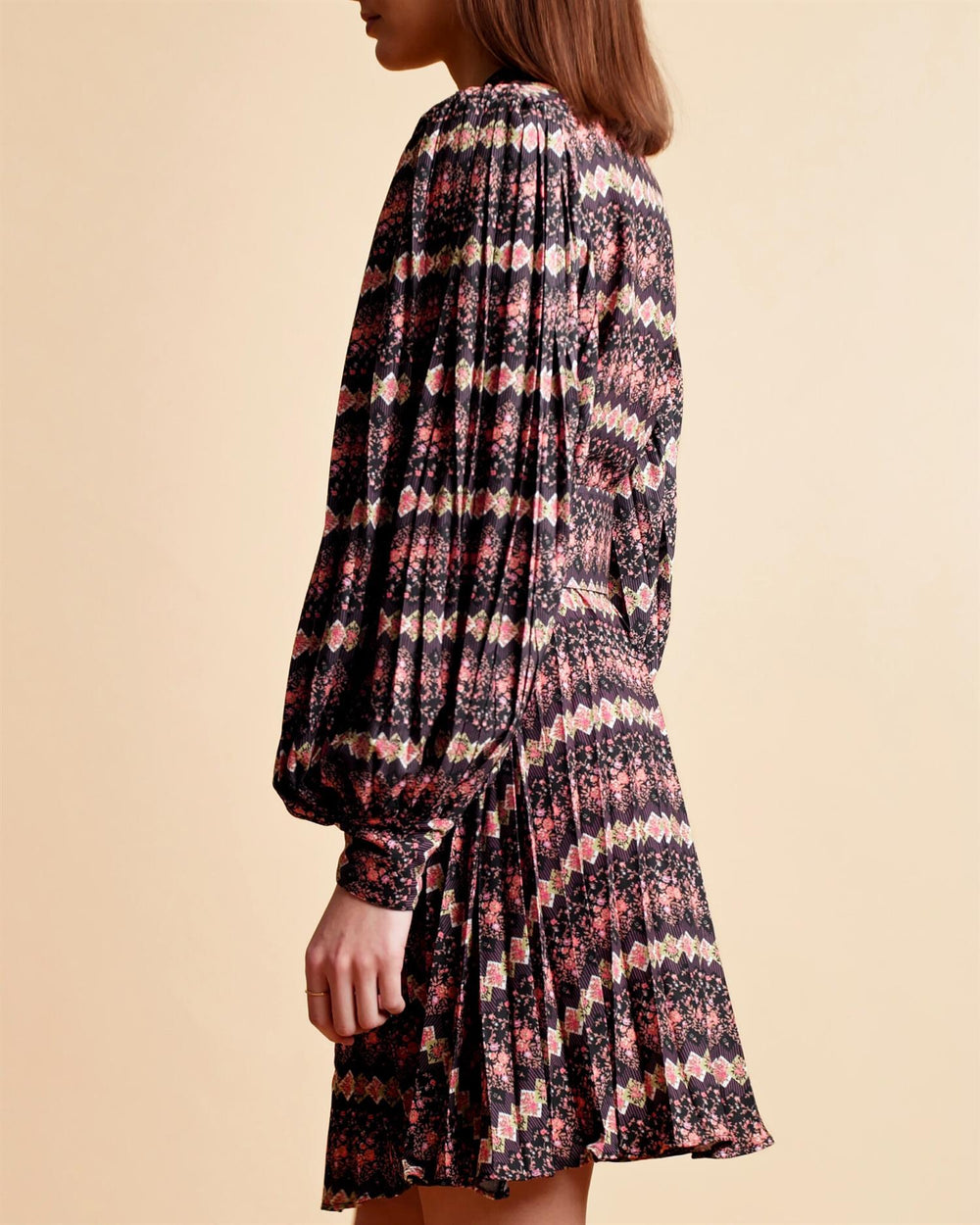 Plissé Mini Dress er kuttet i luftige og delikate polyesterkvalitet, laget i en bred plissé-teknikk. Den har en minilengde, montert midje og lange, voluminøse ermer med stramme mansjetter. Kjolen har en rund hals med stoffdekte knapper foran. Kjolen har blonderinnsatser nedover forsiden av toppen og kommer med et løst, matchende belte.