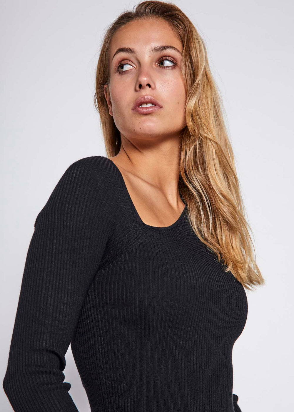Sherrystrikket topp har en asymmetrisk halsåpning i en myk bærekraftig viskoseblanding, den er veldig elastisk og behagelig.